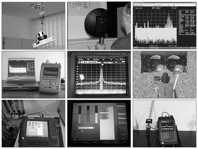 Untersuchung von Räumen und Fahrzeugen auf alle bekannten, durch die Gebäude und Fahrzeugphysik zugelassenen Informationsübertragungsmedien, wie Funk, Leitungsnetze, Körperschall/Laser